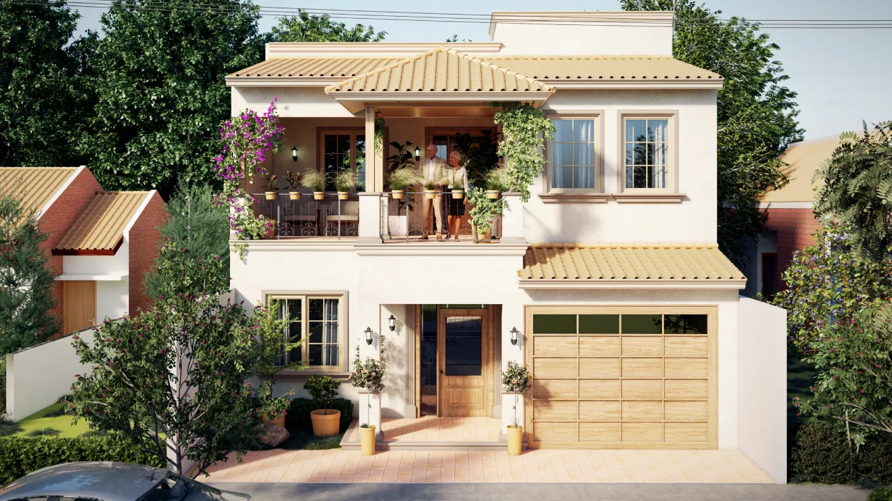 Adem谩s, la casa integra una cochera dentro del volumen principal, lo que permite mantener una imagen ordenada hacia la calle. Los tonos claros en los muros ayudan a reflejar la luz natural y resaltan los detalles arquitect贸nicos, mientras que la cubierta de teja en tonos c谩lidos aporta textura y tradici贸n.