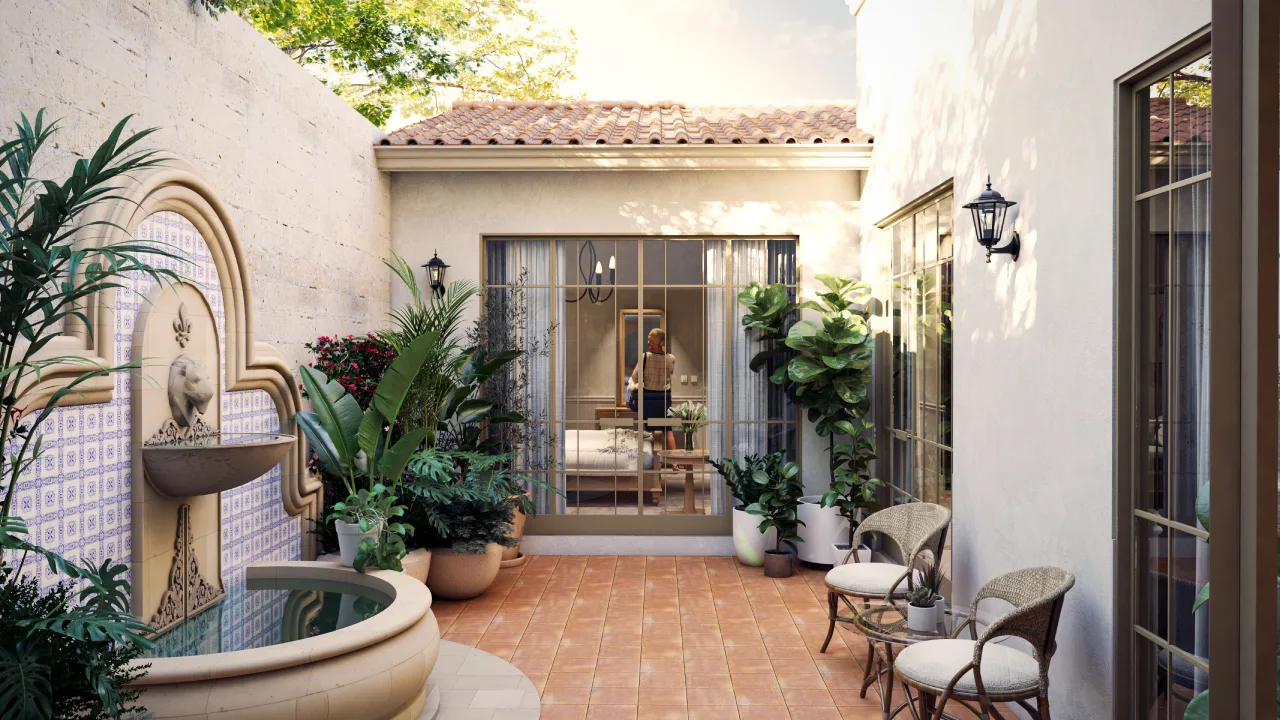 Uno de los aspectos m谩s distintivos de esta casa es el patio interior con fuente y vegetaci贸n, el cual funciona como un elemento central del dise帽o. Este espacio no solo aporta valor est茅tico, sino que tambi茅n mejora el confort t茅rmico y la calidad ambiental.