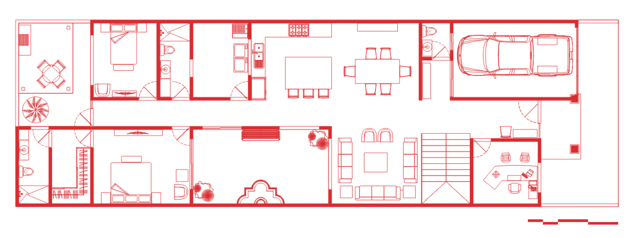 La planta baja se dise帽贸 para albergar las 谩reas sociales de la casa, priorizando la amplitud, la iluminaci贸n natural y la relaci贸n con el patio interior. Al ingresar a la casa, se encuentra un vest铆bulo que conduce hacia la sala principal, el comedor y la cocina, creando una circulaci贸n clara y funcional.