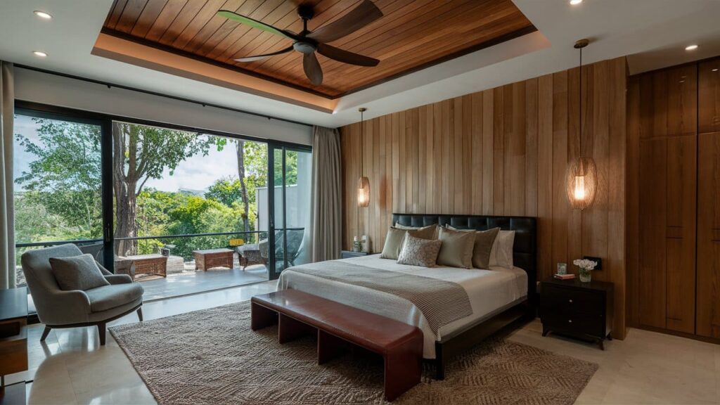 Casa Bolaina es una respuesta audaz al clima tropical de Tabasco. Su diseño se define por el contraste: una volumetría sólida y elegante en tonos oscuros que se suaviza con la calidez de la madera y la transparencia del vidrio. La fachada no solo es estética; sus voladizos funcionan como escudos solares, protegiendo el interior y creando sombras que dan profundidad al diseño.