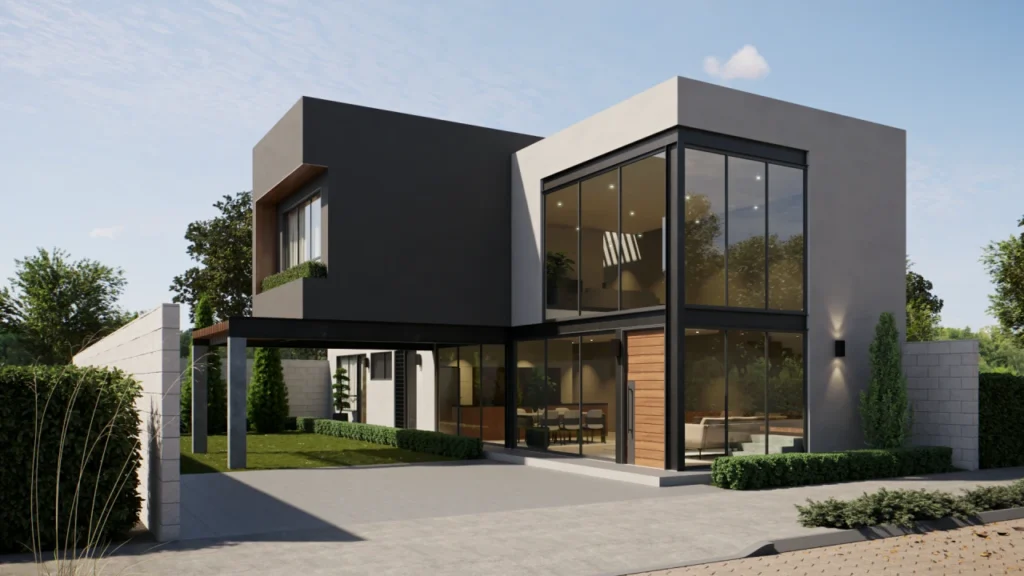 La Residencia Nogal es una casa residencial de estilo moderno contemporáneo diseñada con planos de casa que priorizan amplitud, iluminación natural y conexión interior–exterior. Su fachada combina volúmenes limpios, revestimientos pétreos y ventanales a doble altura que aportan carácter y elegancia.